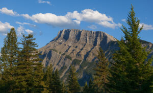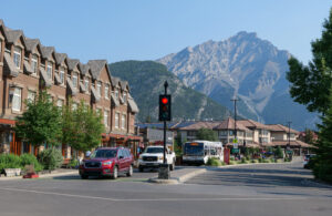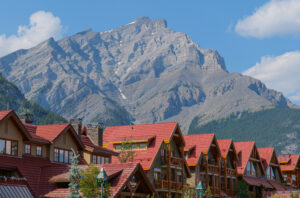 Arquitectura de las casas de Bamff al fondo Cascade Mountain.